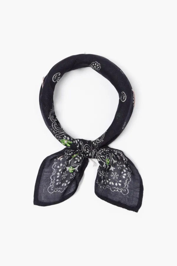 Made From 100% Viscose This Bandana Features Embroidered Flowers With A Loose Thread Detail And Paisley Print. Light And Breathable, It’S Perfect Tied Around Your Neck Or As A Head Scarf.