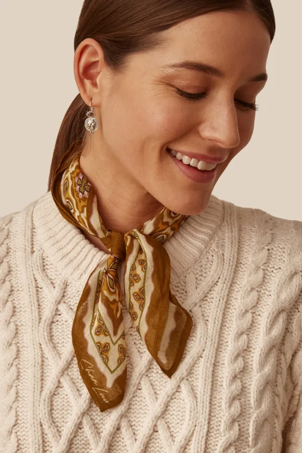 Printed Lightweight Viscose Gauze Bandana In Mineral Yellow Hues. Wear Around Your Neck, As A Headscarf, Or Tie To A Bag Handle For A Playful Accent.