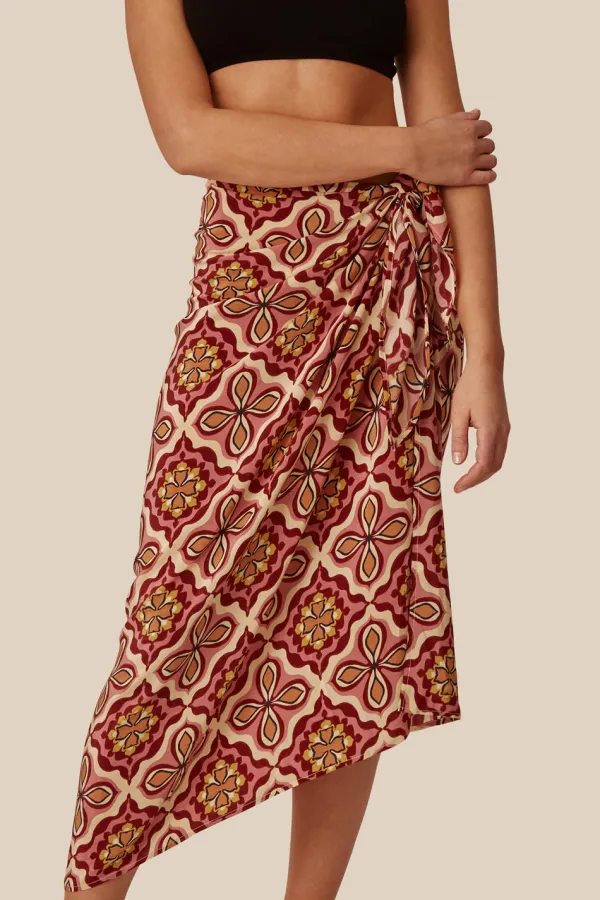 Printed Silk Sarong In Pomegranate Hues. This Versatile Staple Can Be Worn As A Beach Coverup Or Paired With Your Favorite Evening Accessories.
