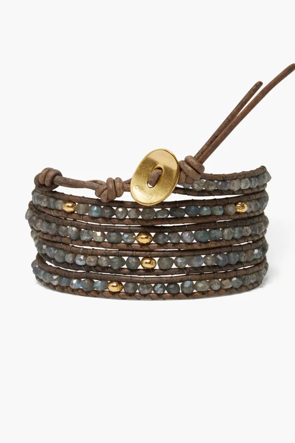Our Signature Five Wrap Bracelet Featuring Glittering Lengths Of Blue Labradorite, Mystic Labradorite, And Gold Plated Beads On Natural Grey Leather. A Classic Design Perfect On Its Own Or Layered With More Bracelets.