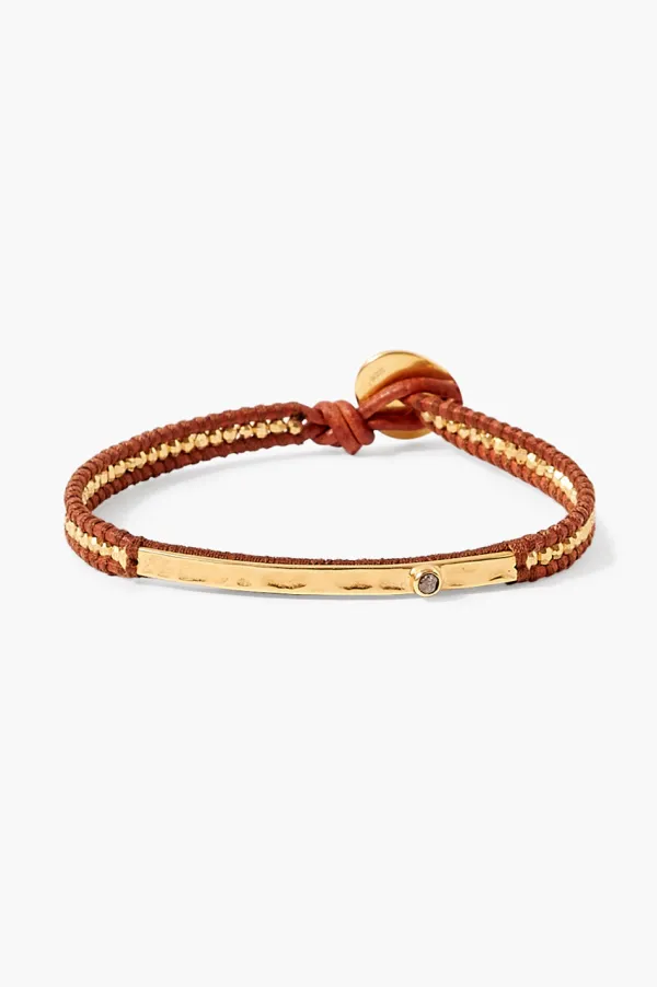 Our Signature Single Wrap Bracelet Featuring 18K Gold Plated Nuggets And A Gold Bar Pendant With A Champagne Diamond Inlay Woven Between Layers Of Natural Dark Brown Leather.