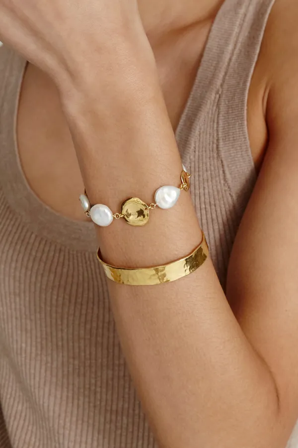 A Timeless Pairing That Combines Two Of Our Classic Silhouettes. This Pairing Of Our White Keshi Pearl Bracelet And Yellow Gold Hammered Cuff Is An Illuminating Addition To Any Look.