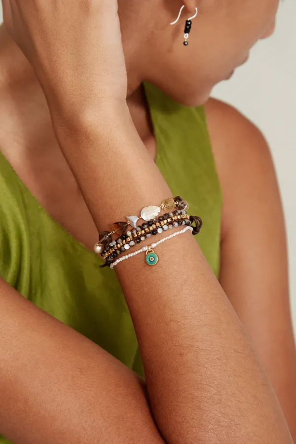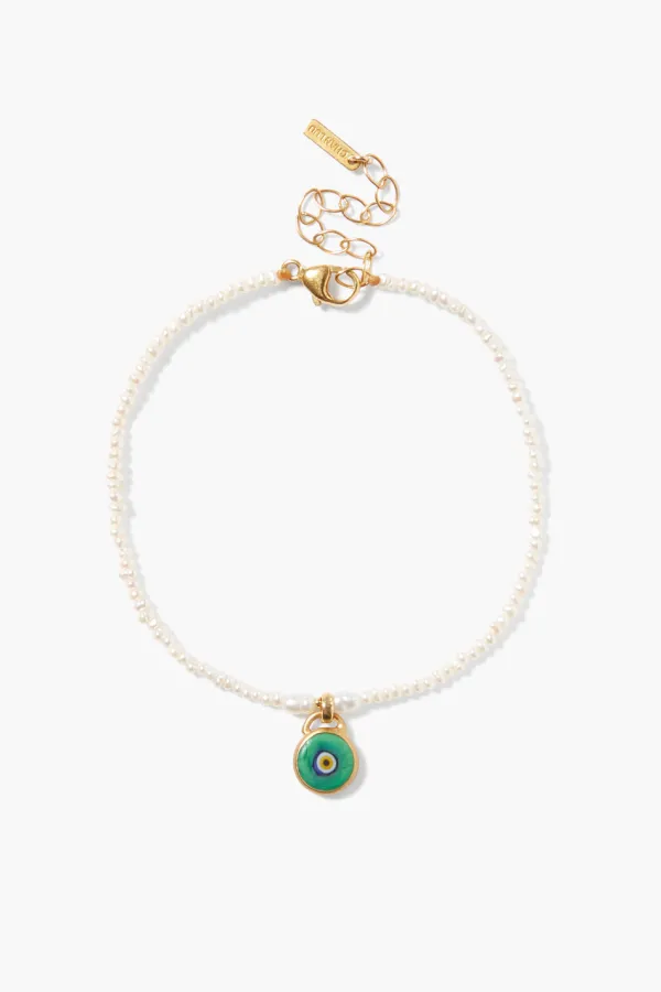 A Bracelet Of Petite Freshwater Rice Pearls With A Striking Green Hand-Rolled Clay Evil Eye Pendant Is A Playful Take On This Classic Symbol Of Protection. A Dainty Piece To Layer Or Style Solo.
