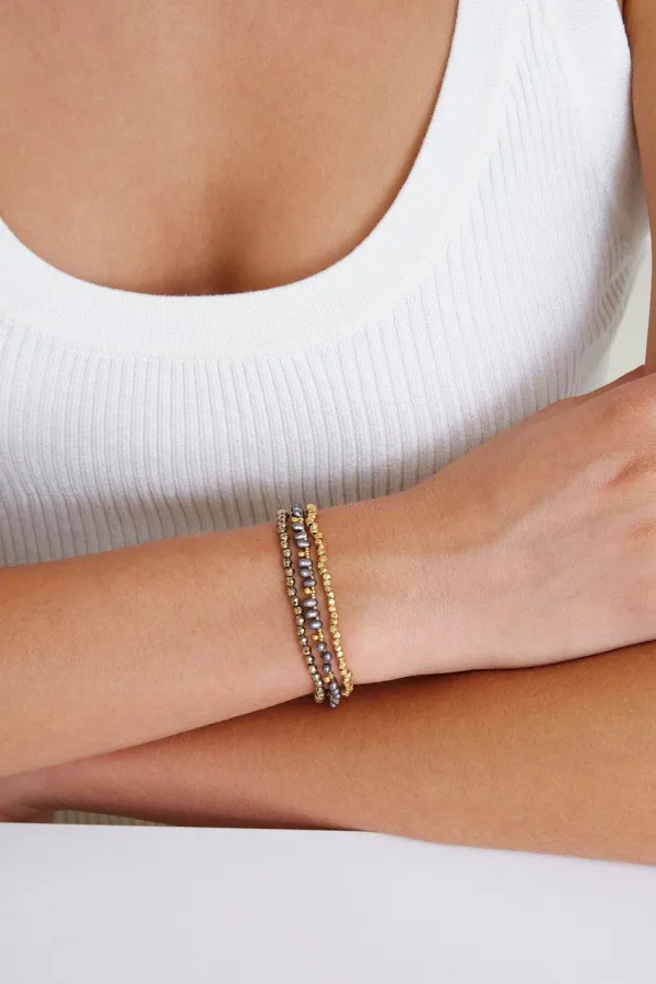 Pearls Suspended Between Layers Of Metallic Stones Give New Shape And Movement To Our Iconic Naked Wrap Bracelet. This Three-Layer Wrap Features Grey Pearls, Titanium Pyrite And Gold Nuggets. Fastens With An 18K Gold Plated Sterling Silver Signature Oval Button.