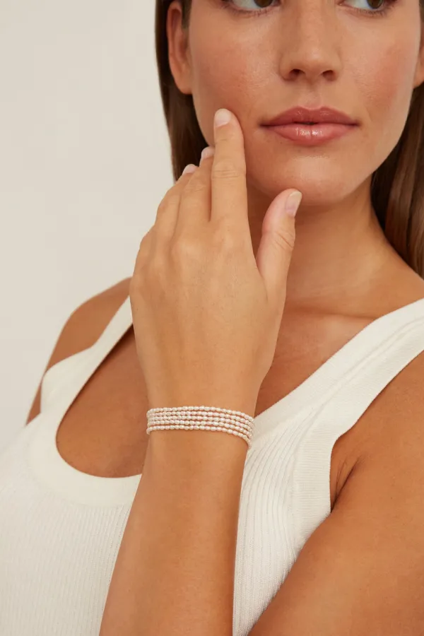 A Minimalist Addition To Our Signature Naked Wrap Bracelet Collection. Five Layers Of Delicate White Freshwater Rice Pearls Are Strung Along Gossamer Taupe Cording For A Sleek Look.