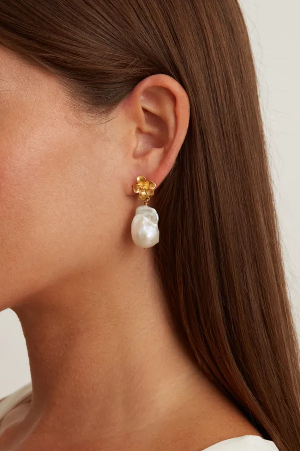 A Tropical Vibe Emanates From Artisan-Crafted Gold Hibiscus Studs With A Luminescent Baroque Pearl Drop.
