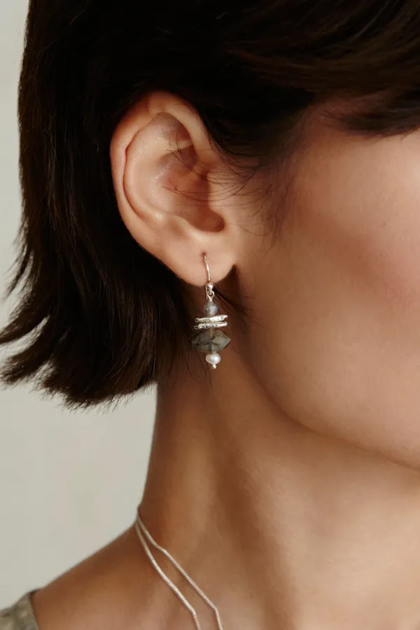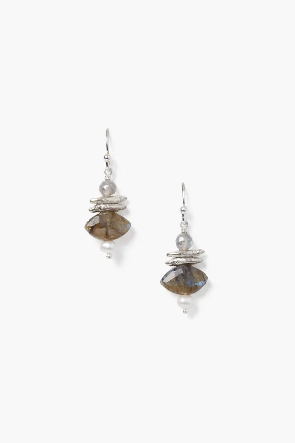 Strike A Balance With These Petite Drop Earrings Featuring A Stack Of Freshwater Pearls, Silver Chips And A Marquise Cut Labradorite.