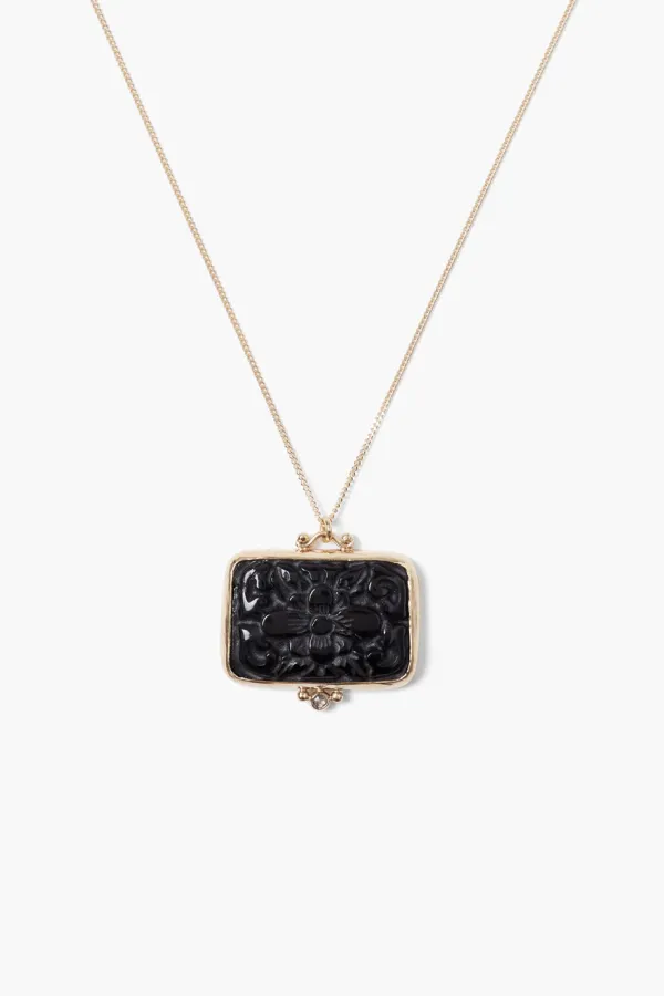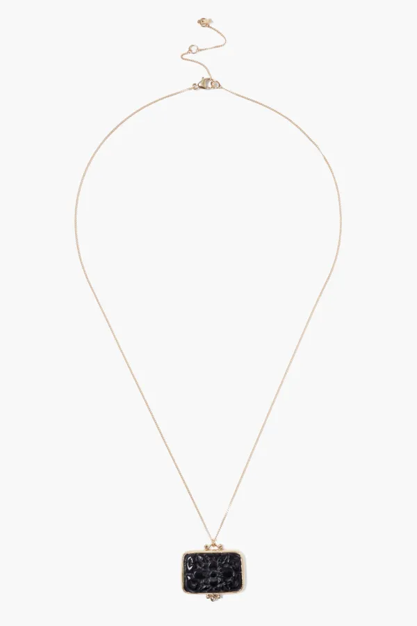 A Luminous Hand Carved Obsidian Flower Pendant With A Diamond Inlay Strung On A Solid 14K Gold Chain.
