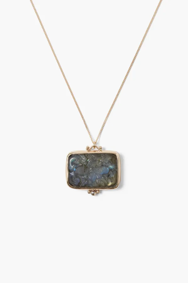A Luminous Hand Carved Labradorite Flower Pendant With A Diamond Inlay Strung On A Solid 14K Gold Chain.