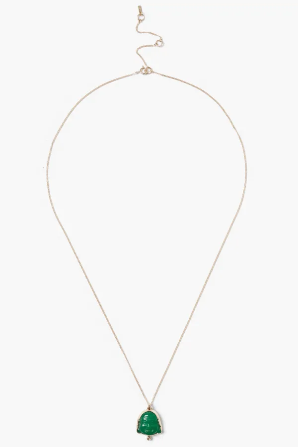 This 14K Yellow Gold Necklace Features A Carved Quartz Buddha Wrapped In Solid Gold With A Diamond Inlay.