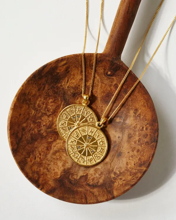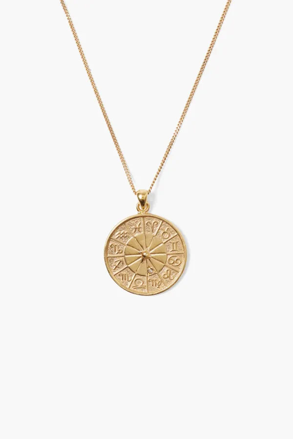 The Stars Align In This 18K Gold Plated Necklace Featuring A Coin Stamped With All 12 Zodiac Signs. A Single .01Ct White Diamond Is Set On Your Sign Of Choice.
