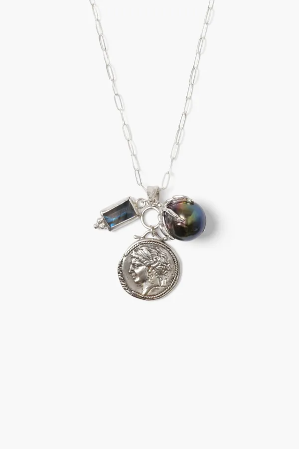 A Sterling Silver Coin With A Stamped Portrait Is The Centerpiece Of This Charming Necklace Featuring Charms Of Labradorite And A Pearl Clasped In A Silver Claw. The Perfect Length For Layering.