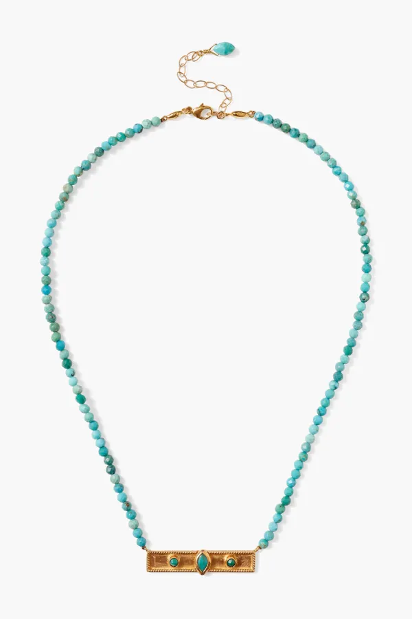 Reminiscent Of Ancient Jewels, An 18K Gold Plated Bar Pendant With A Trio Of Turquoise Pendants Centers A Necklace Of Piercing Turquoise Rounds.