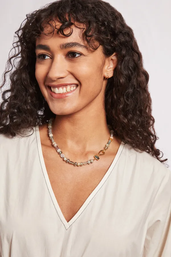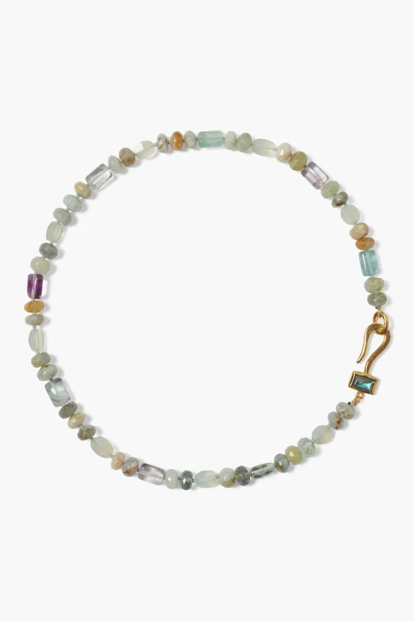 Green Blue Aquatic Tones Prevail In This Gemstone Necklace Featuring Moss Aquamarine, Green And Purple Fluorite, And Labradorite. A Statement Design Perfect On Its Own Or Layered With Longer Necklaces.