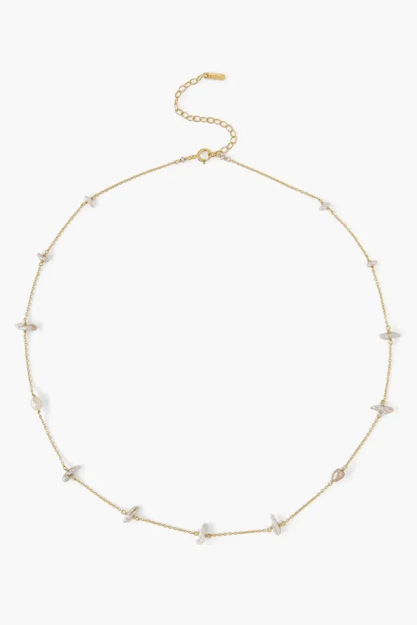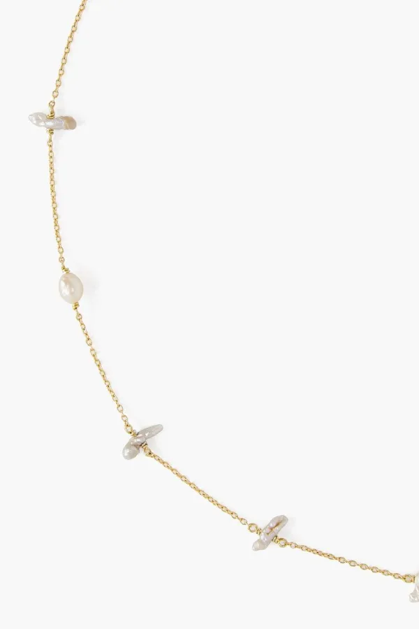 A Minimal Design That Emphasizes The Natural Form Of Pearls. Grey Biwa Stick Pearls, Natural Pink Rice Pearls, And Pearl Chips Dot A Simple 18K Gold Plated Sterling Silver Necklace. A Subtle Silhouette For Everyday.