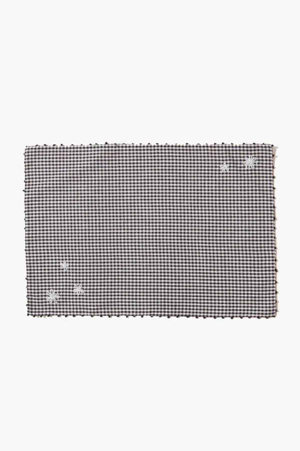 A Set Of 2 Woven Black Gingham Placemats With French Knot Detailing Adds A Touch Of Whimsy To Any Table. Features A Playful Contrasting Floral Embroidery.