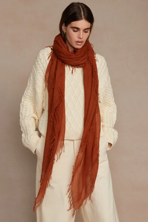 Our Signature Cashmere And Silk Blend Scarf In A Warm Gingerbread Hue. Super Soft And Lightweight With A Playful Fringed Trim. This Scarf Is Perfect For Year-Round Wear.