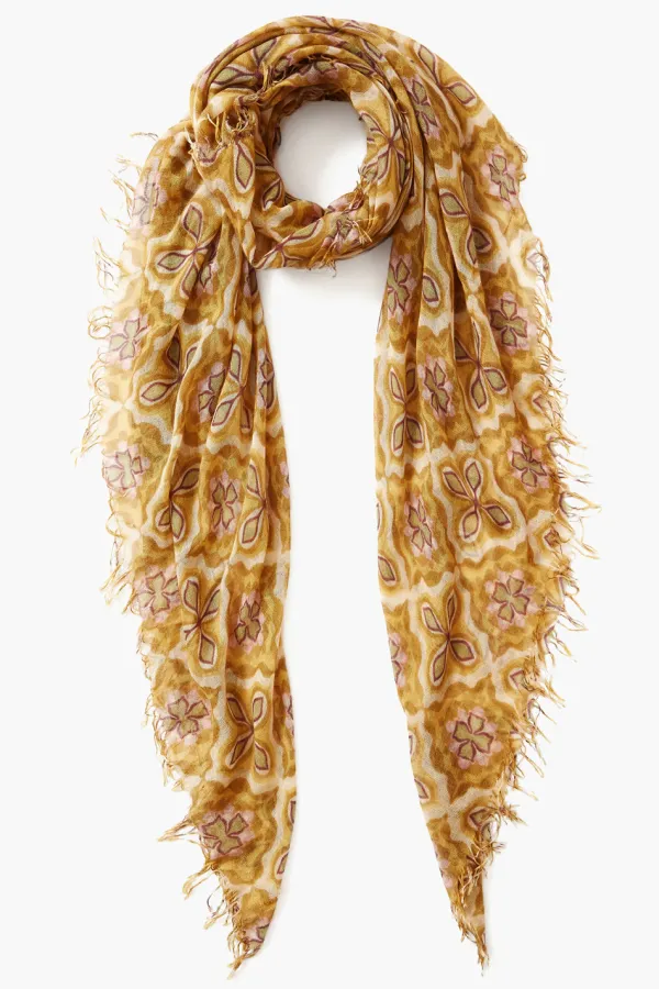 A Striking Printed Pattern In Mineral Yellow Hues Decorates This Signature Cashmere And Silk Blend Scarf. Lightweight With A Fringed Trim. This Scarf Is Perfect For Year-Round Wear.