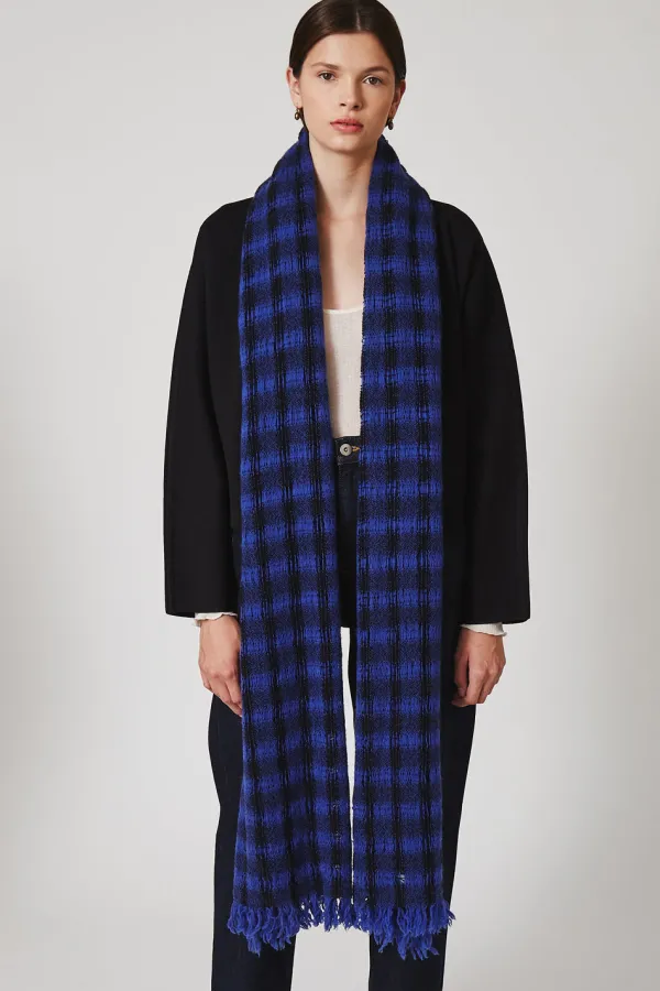Ideal For Draping, This 100% Wool Scarf Features Black And Sapphire Cutout Checker Detailing And Twisted Fringed Ends.