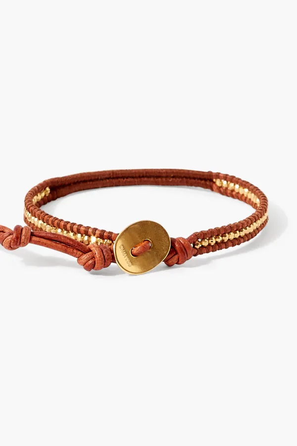 Our Signature Single Wrap Bracelet Featuring 18K Gold Plated Nuggets And A Gold Bar Pendant With A Champagne Diamond Inlay Woven Between Layers Of Natural Dark Brown Leather.