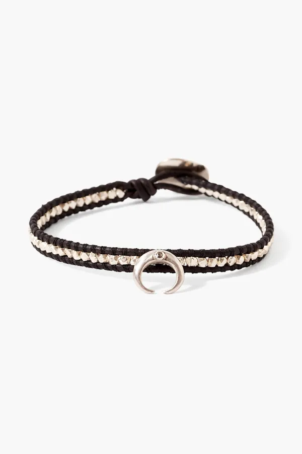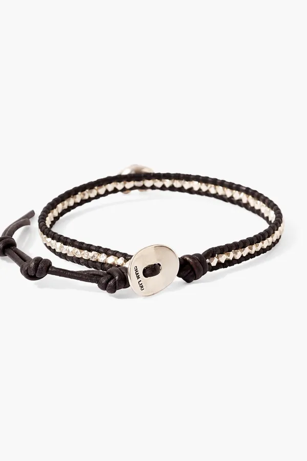 Our Signature Single Wrap Bracelet Design Featuring Sterling Silver Nuggets Woven Between Layers Of Natural Black Leather With A Silver Bull Horn And Champagne Diamond Inlay. A Simple Silhouette Designed To Be An Essential Piece In Your Wardrobe.
