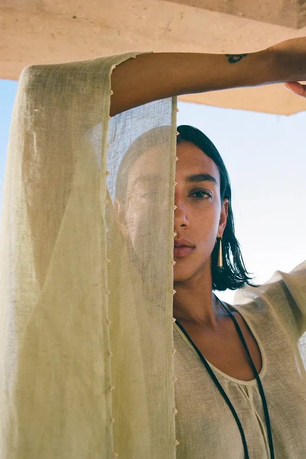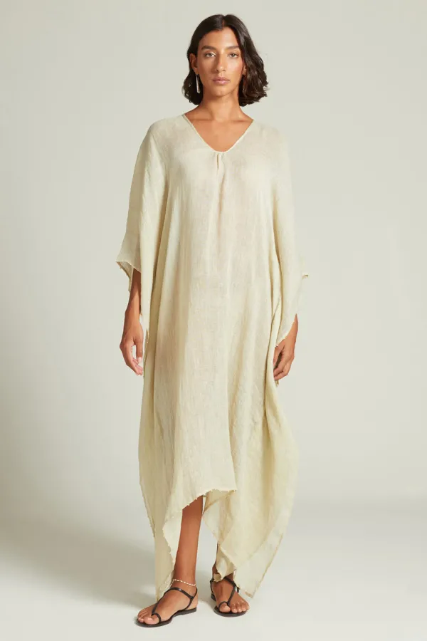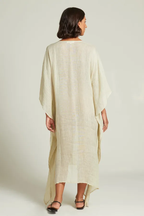 This 100% Linen Caftan In A Light Sage Hue With A White Beaded Trim Is An Ideal Loungewear Staple. Made From Breezy Linen Fabric It Can Be Worn As A Beach Coverup Or Paired With Your Favorite Evening Accessories.