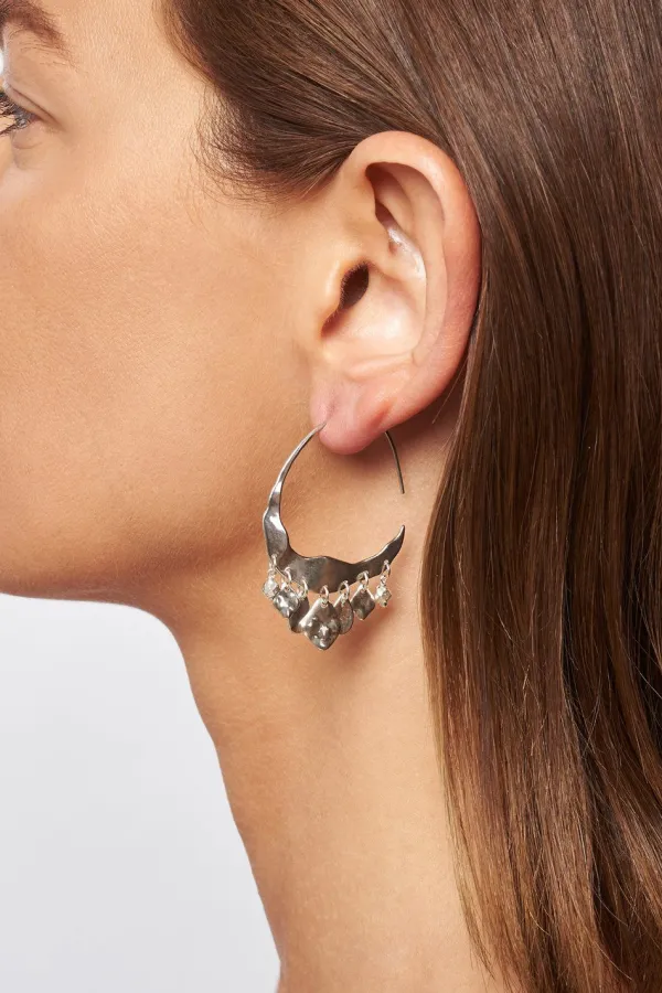 Striking Silver Charms Adorn An Organic Hand-Hammered Silver Crescent Hoop. An Elevated Version Of Our Signature, Bestselling Silver Crescent Moon Hoops.