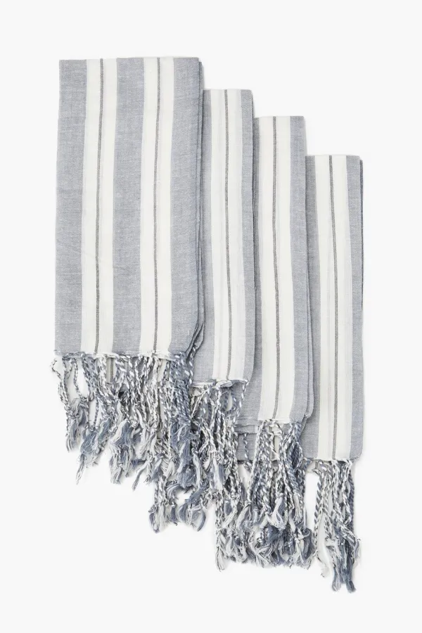 Woven From 100% Cotton, This Set Of 4 Kitchen Towels Will Bring A Touch Of Rustic Style To Your Home. Their Versatile Size Makes Them Perfect For Either Dish Cloths Or Dinner Napkins. Features Contrasting Chambray Blue Stripes And A Decorative Twisted Tassel Fringe.