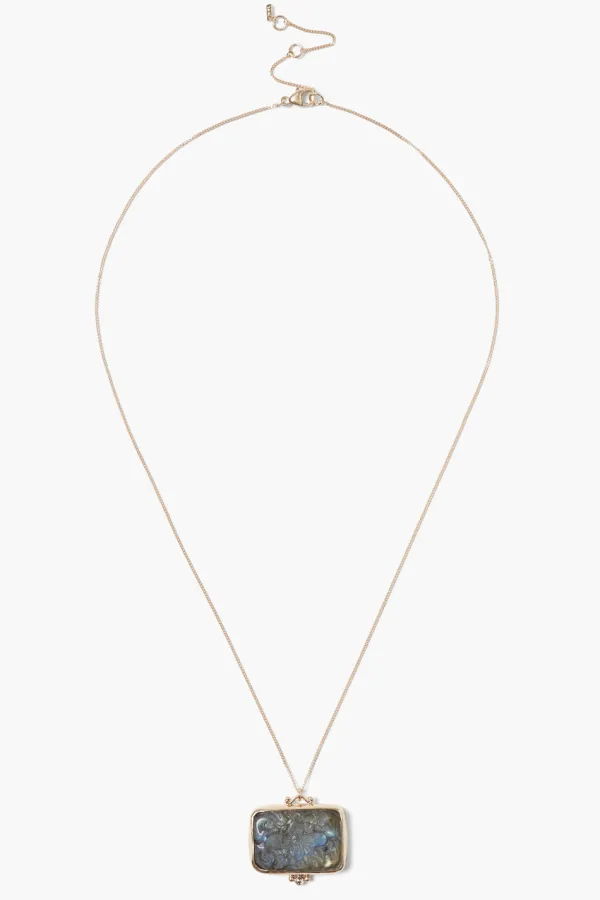 A Luminous Hand Carved Labradorite Flower Pendant With A Diamond Inlay Strung On A Solid 14K Gold Chain.
