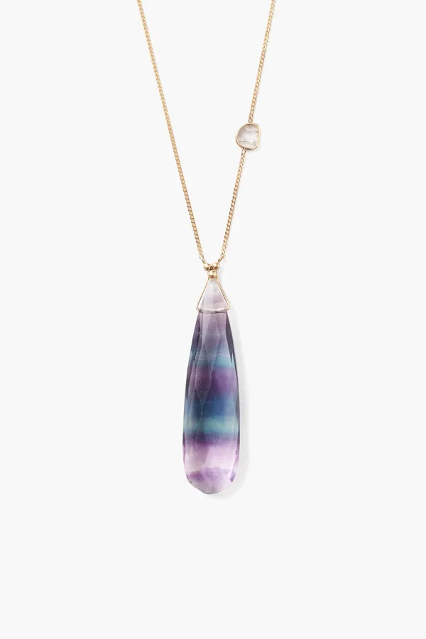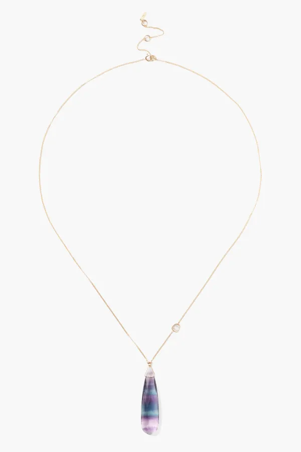 A Night Sky Scene Is Captured In This Teardrop Fluorite Pendant With Layers Of Purple And Teal. A Single Diamond Slice Embellishes The 14K Gold Chain.