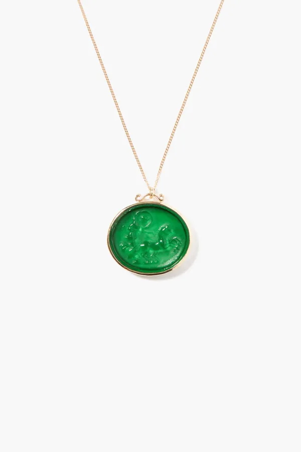 Carved Green Glass Intaglio Depicting A Gladiotor On A Chariot, Wrapped In 14K Gold On A Solid Gold Chain.