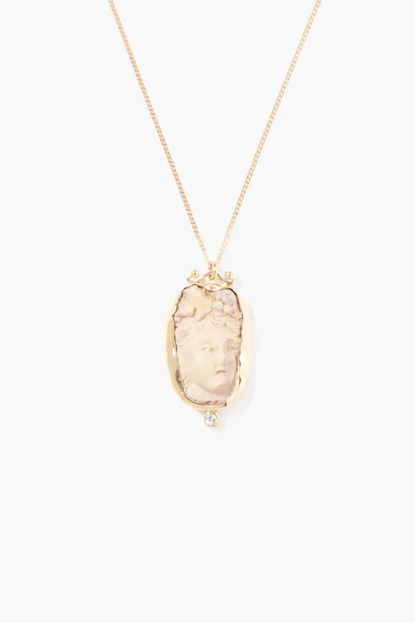 A Carved Beige Lava Cameo Pendant Wrapped In 14K Yellow Gold With A .03Ct Diamond Inlay Decorates A Delicate Solid Gold Chain.