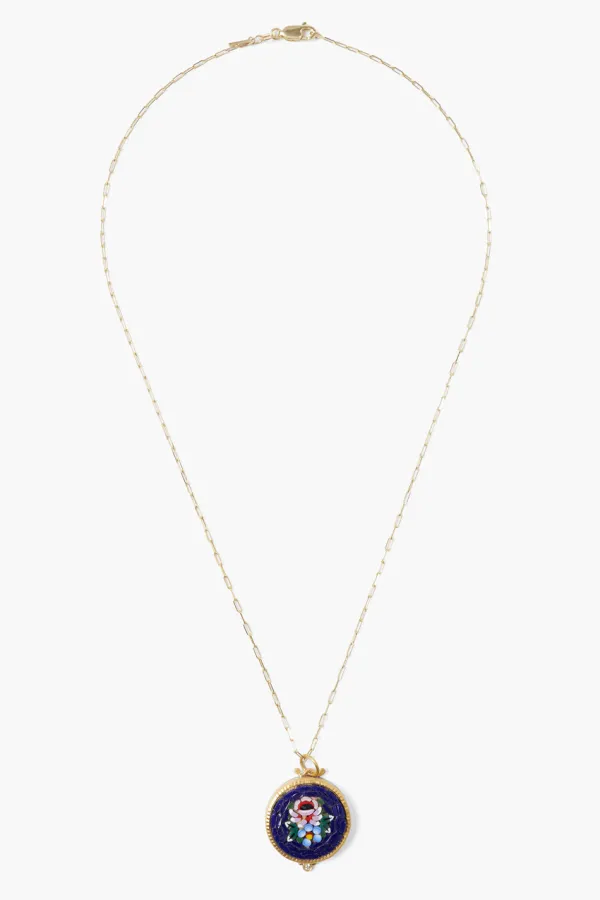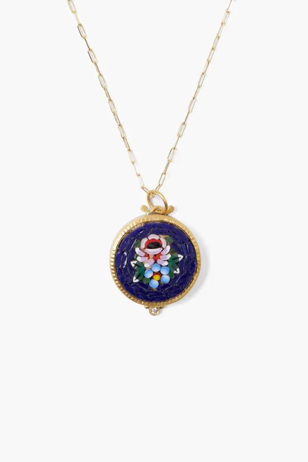 Tiled Mosaic Pendant Depicting A Bouquet Of Flowers, Wrapped In 24K Gold And Sterling Silver With A .02Ct Diamond Inlay On A 14K Gold Chain.