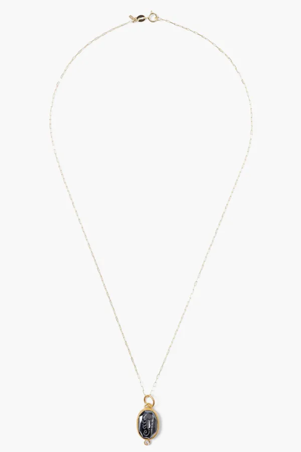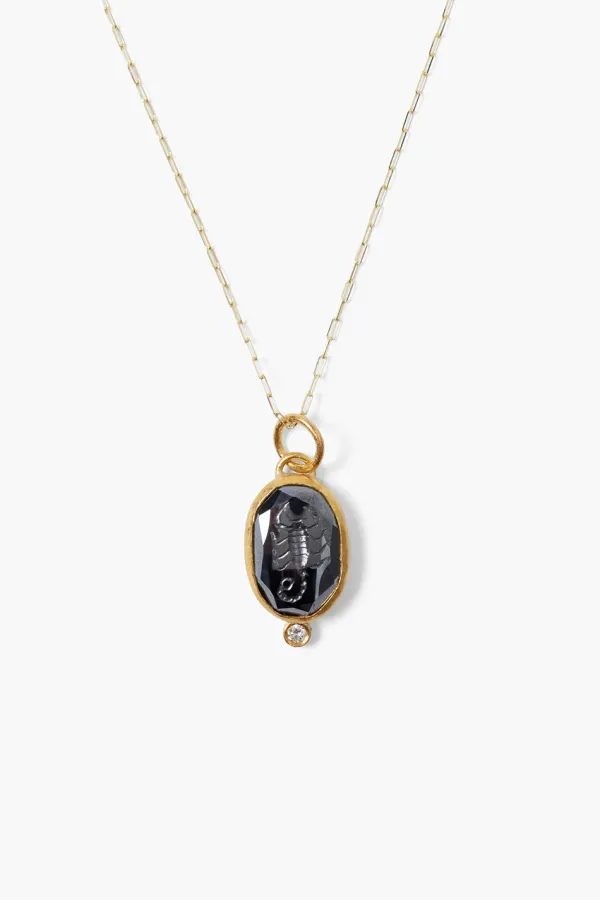 Carved Hematite Intaglio Depicting A Scorpion, Wrapped In 24K Gold And Sterling Silver With A .02Ct Diamond Inlay On A 14K Gold Chain.