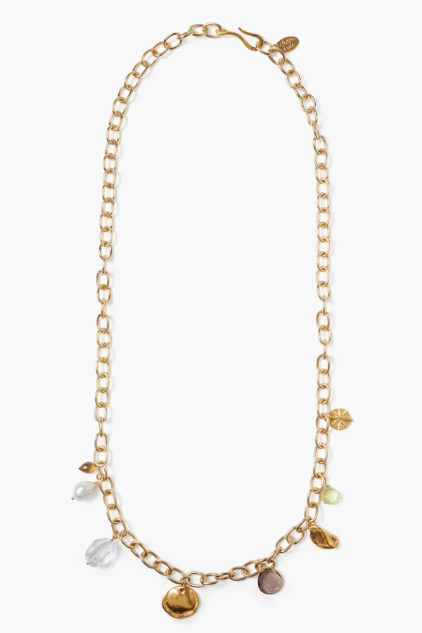 This Gold Plated Base Metal Necklace Shimmers With Lemon Topaz, Quartz, Baroque Pearl, And Gold Coins.