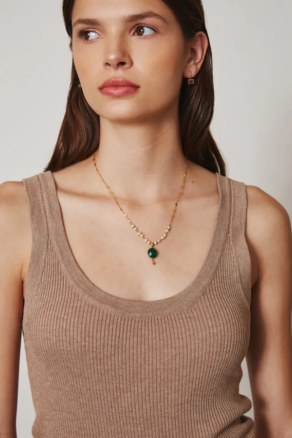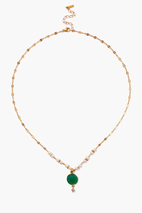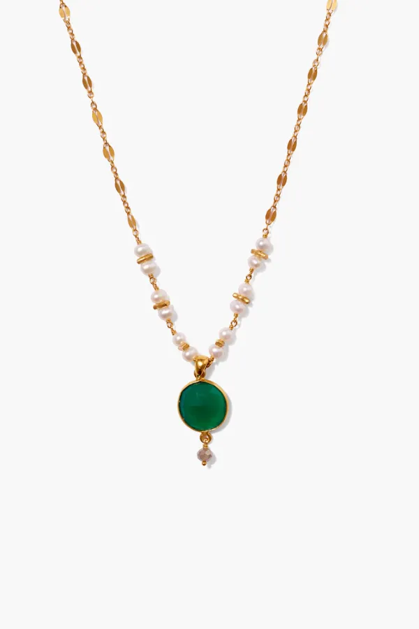 An Elegant Necklace Dotted With Luminous Pearls On A Flat Link Gold Chain. Features An Indian Aventurine Wrapped Coin Pendant With Mystic Labradorite Drop.