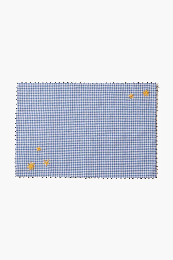 A Set Of 2 Woven Blue Gingham Placemats With French Knot Detailing Adds A Touch Of Whimsy To Any Table. Features A Playful Contrasting Floral Embroidery.